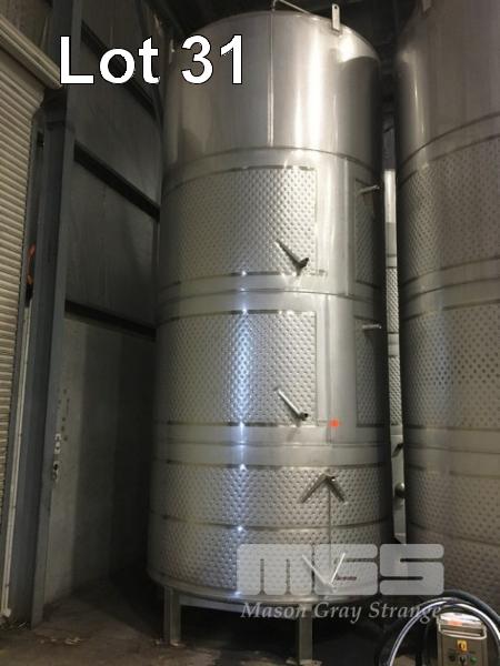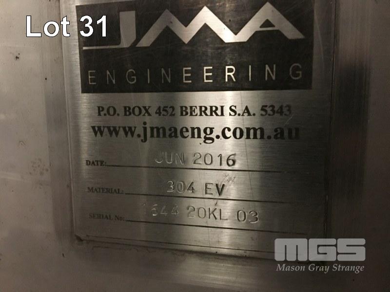 JMA ENGINEERING TANK, 20,000 LITRES CAP (APPROX) CAVITY JACKET, STAINLESS STEEL DOM: 2016 TEST PRESSURE: 1640KPA WORK PRESSURE: 350KPA MATERIAL: 304EV S/NO: 1644 20 KL 03 FITTED WITH LIFTING LUGS, BOTTOM TOP & SIDE INLET/OUTLETS, SIDE INSPECTION HATCH, 3 SECTION JACKET