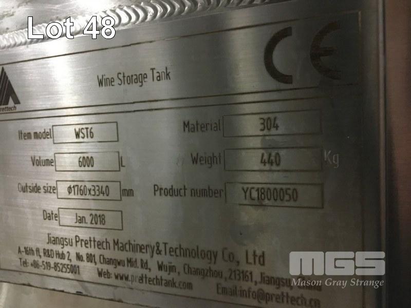PRETTECH TANK, 6,000 LITRES CAP (APPROX) STAINLESS STEEL, MATERIAL: 304 MOD: WST6 S/NO: YC1800050 DOM: 2018 WEIGHT: 440kg OUTSIDE DIAM: 1760 x 3340mm (H) BOTTOM, TOP & SIDE INLET/OUTLET VALVES, TOP & SIDE INSPECTION HATCHES, LIFTING LUGS & TEMP GAUGE