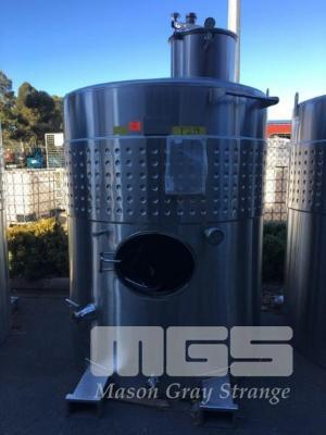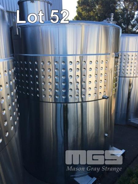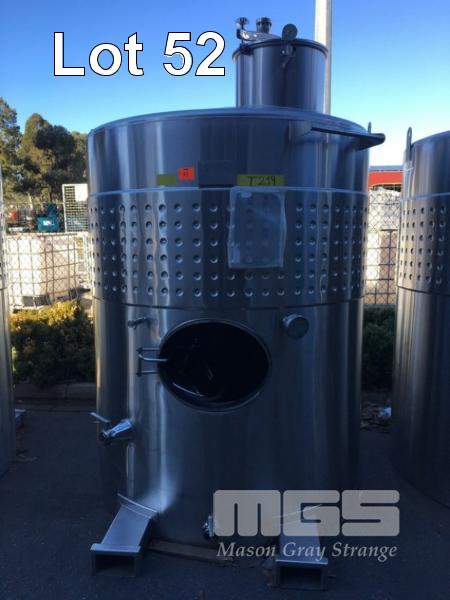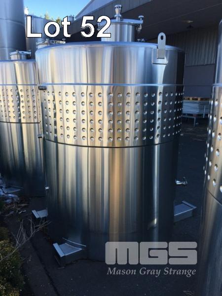 ASSOCIATED GLASS & TANK (AWE WINE GROUP) TANK 3,600 LITRES CAP JACKETED STAINLESS STEEL MATERIAL: 304 MOD: WST35 S/NO: YC1803705 DOM: 2018 WEIGHT: 470kg OUTSIDE DIAM: 1600 x 2690mm (H) BOTTOM, TOP & SIDE INLET/OUTLET VALVES TOP & SIDE INSPECTION HATCHES, LIFTING LUGS COOLING AREA: 2.6m2 FORK POCKETS