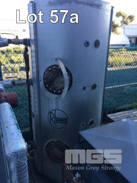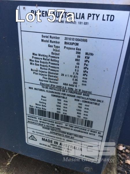 GAS FIRED HEATER, RHEEM RYPACK MPD: B0430PCM S/NO: 201610100040995 PROPANE GAS FIRED WITH RHEEM HOLDING TANK INSULATED SIZE: 1000mm DIAM x 2150mm (H) (TO BE DISCONNECTED AT FIRST VALVE, NOT INC PIPEWORK)