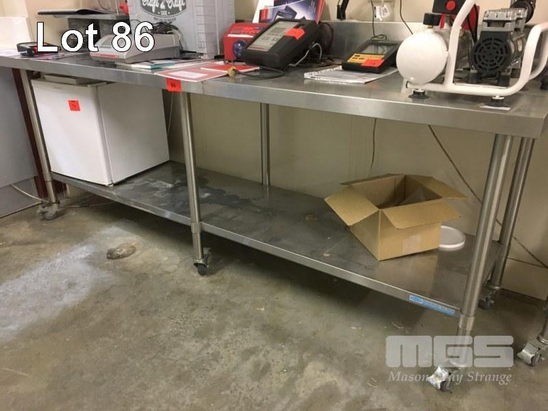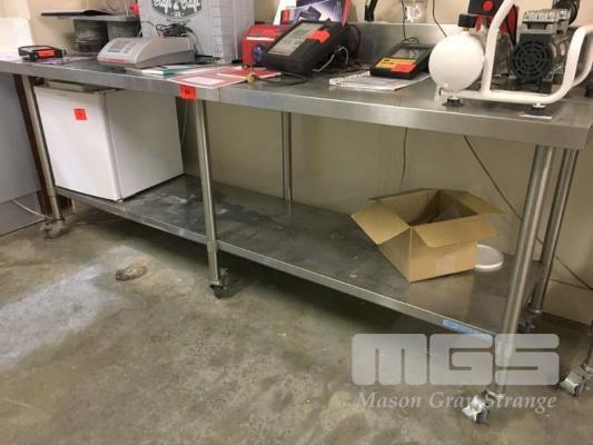 STAINLESS STEEL LAB BENCH, MOBILE, 2 TIER, 2400 x 700 x 900mm (H) WITH SPLASHBACK ON CASTORS