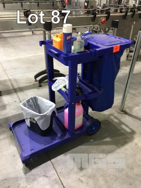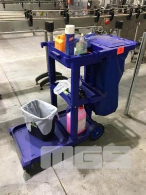 CLEANERS TROLLEY, CHAO BAO BLUE POLY & ASSORTED CLEANING CHEMICALS, ETC