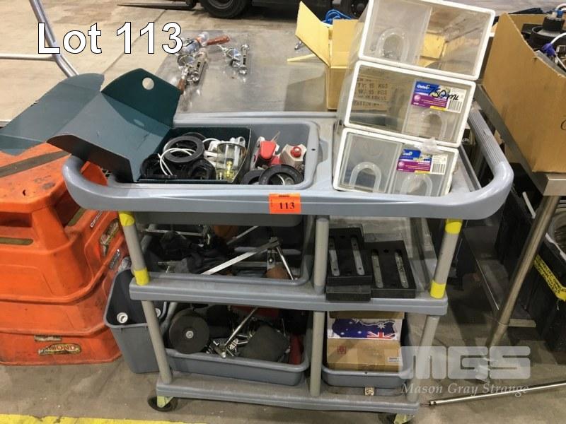 PARTS TROLLEY & ASSORTED BOTTLING LINE COMPONENTS INC ROLLER PADS, MOUNTS, SPACERS, ADAPTORS, IN LINE FILTERS, ETC