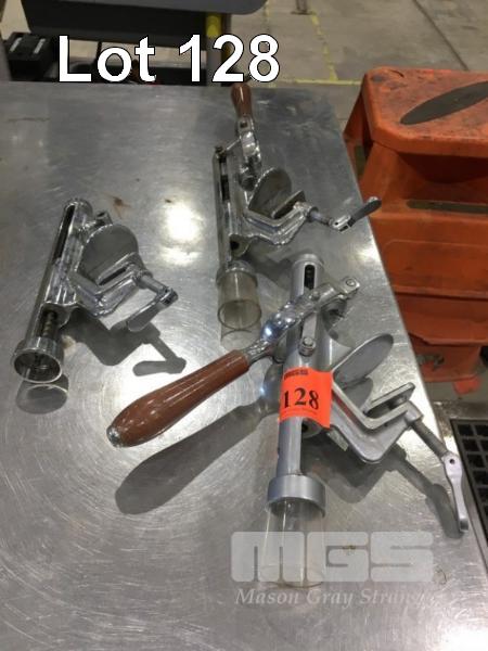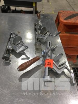 3 x BOTTLE CORK REMOVAL HAND PRESSES, BENCH MOUNT, (1 x MISSING PARTS)