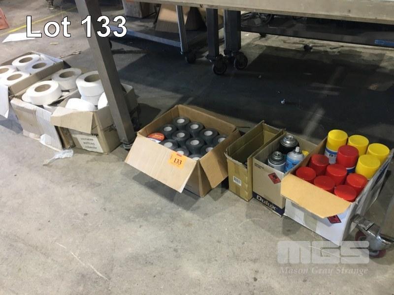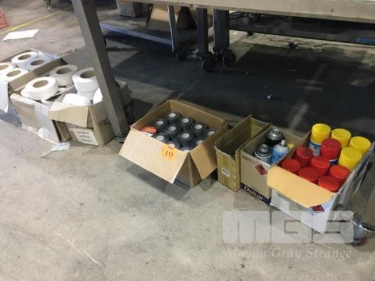 DY-MARK LINE MARKING SPRAY PAINT, DUCT TAPE, SILVER PVC & PARROT KNIVES, (4 x BOXES) & 3 x BOXES PLAIN WHITE ADHESIVE LABELS