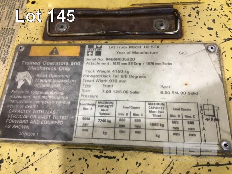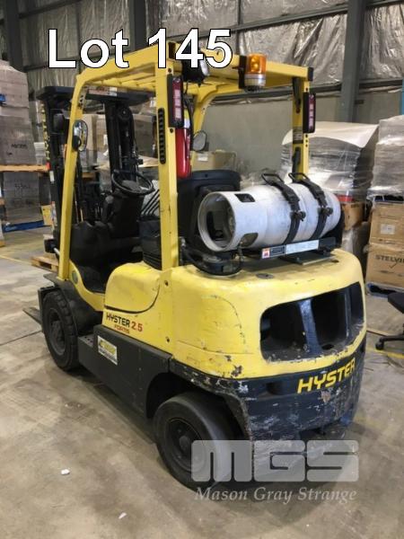 FORKLIFT HYSTER H2.5TX HOURS: 10,217hours SHOWING 4 CYLINDER, LPG, S/NO: B466RD03522D MAX CAP: 2240kg @ 600mm 3 STAGE CONTAINER MAST WITH SIDE SHIFT PLUMBED FOR CARTON PUSH PULL ATTACHMENT SOLID TYRES (NOT INCLUDING LPG BOTTLE) (FORKLIFT TO STAY ONSITE FOR 48 HOURS FOR LOADING) (NO PAPERS, NO OWNER'S MANUAL, NO SERVICE BOOKS)