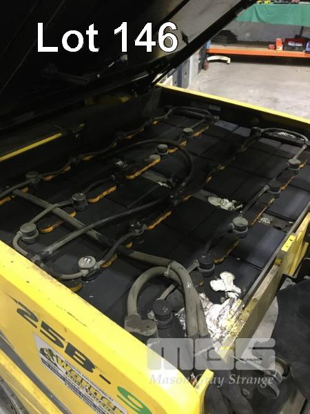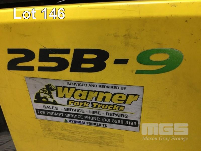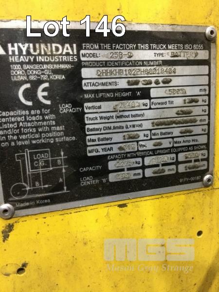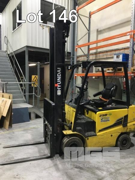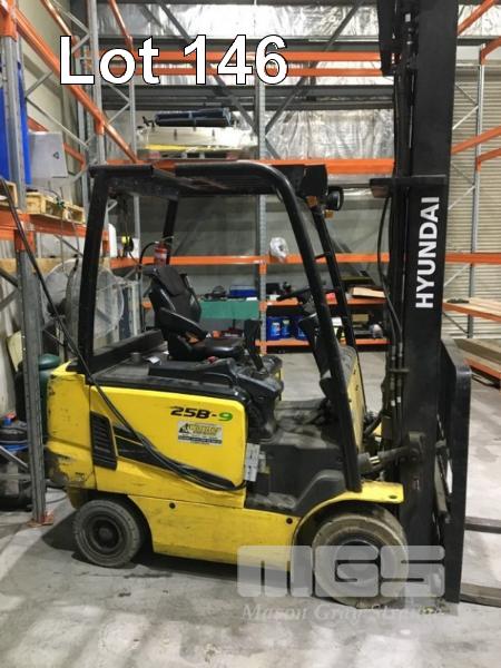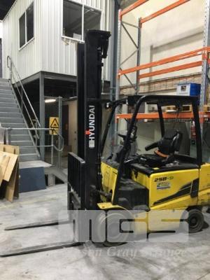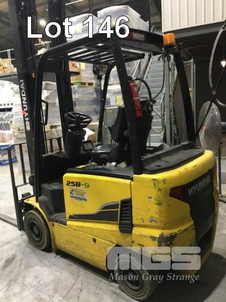ELECTRIC FORKLIFT 2017 HYUNDAI 25B-9 HOURS: 6600 HK SHOWING ID: NNKNB102PH0001840 LIFT CAP: 2275kg @ 500mm MAX HEIGHT: 5000mm 2 STAGE MAST SOLID TYRES WITH BATTERY CHARGING UNIT & WATER TOP UP DRUM (NO PAPERS, NO OWNER'S MANUAL, NO SERVICE BOOKS)