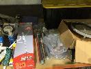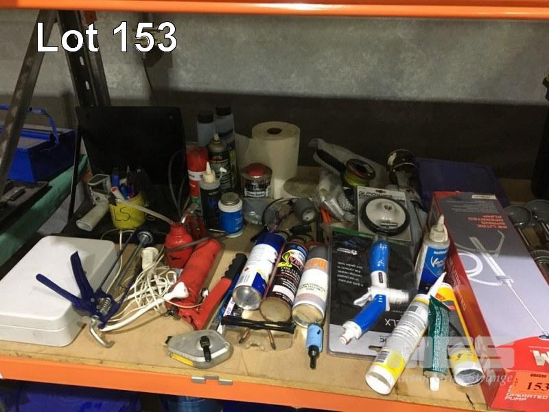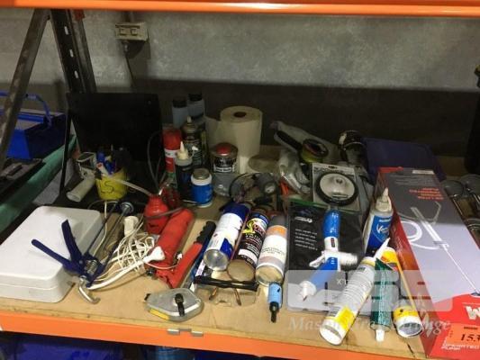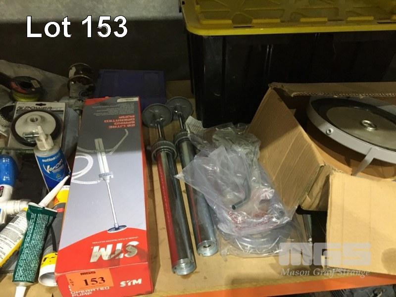 3 x 20 LITRE DRUM PUMPS, 1 x 20 LITRE DRUM GREASE PUMP & HAND PIECE, ASSORTED TOOLS, ADHESIVES & SPRAY CANS, ETC, 1 x SHELF