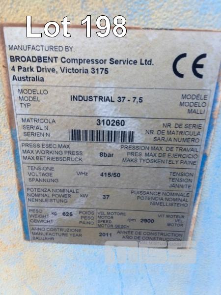 AIR COMPRESSOR, BROADBENT MOD: INDUSTRIAL 37-7.5 8 BAR WORK PRESS DOM: 2011 415V ALL FAULTS
