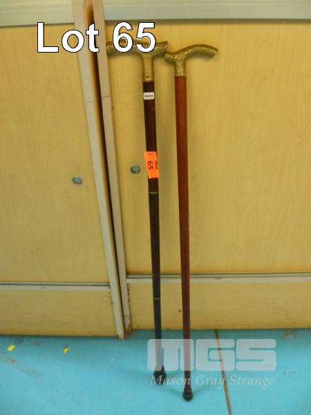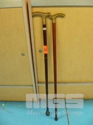 2 x WALKING STICKS, BRASS HANDLES (1 x 3 PIECE UNSCREW)