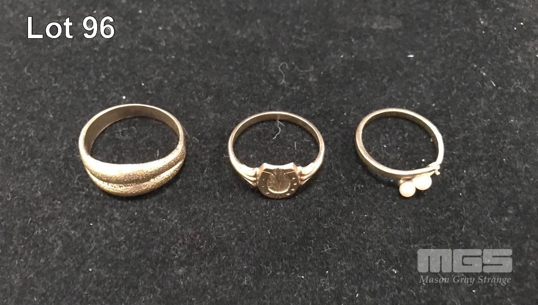 3 x GOLD RINGS, 1 x HORSE SHOE SIGNET, 1 x WAVE PATTERN, 1 x PEARL SETTING (1 x PEARL MISSING), 9ct, 7.8gm