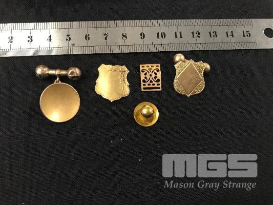 3 x GOLD NON-MATCHING CUFF LINKS, SHIELD CLIP & PENDANT, 9ct, 7.6gm TOTAL WEIGHT