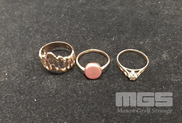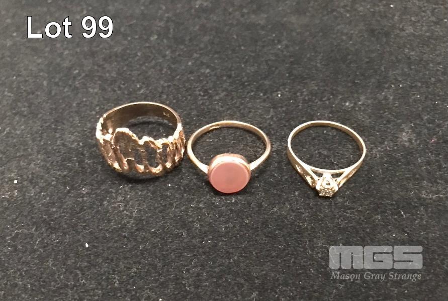 3 x GOLD RINGS, 1 x RUSTIC ARCH TOPPED, 1 x ORANGE STONE SETTING, 1 x SMALL DIAMOND SETTING, 9ct, 7.3gm