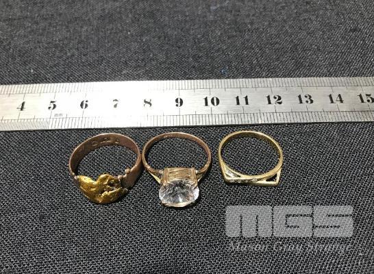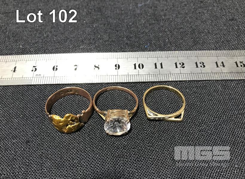 3 x GOLD RINGS, 1 x GOLD NUGGET LOOK, 1 x DIAMOND CHIP SETTING, 1 x CUT CLEAR STONE SETTING, 9ct, 8.6gm