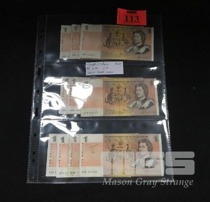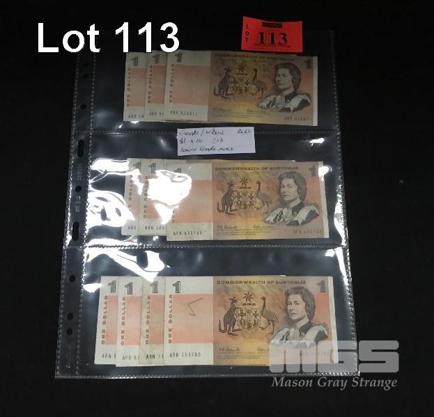 10 X AUSTRALIAN ONE DOLLAR PAPER BANKNOTES, COOMBES/WILSON, A PREFIXES