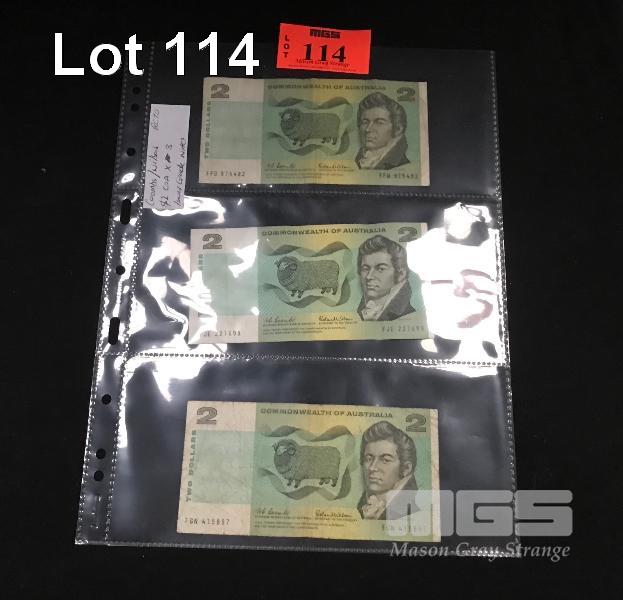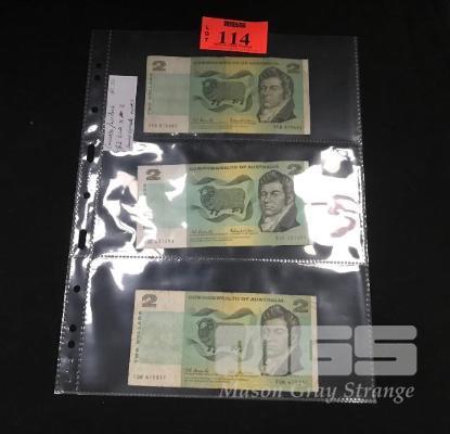 3 X AUSTRALIAN TWO DOLLAR PAPER BANKNOTES, COOMBES/WILSON, F PREFIXES