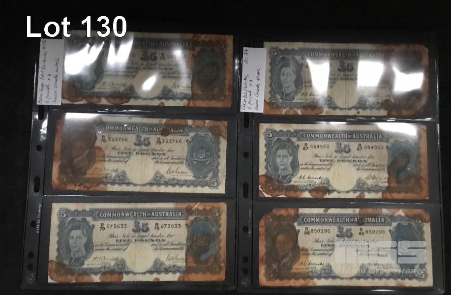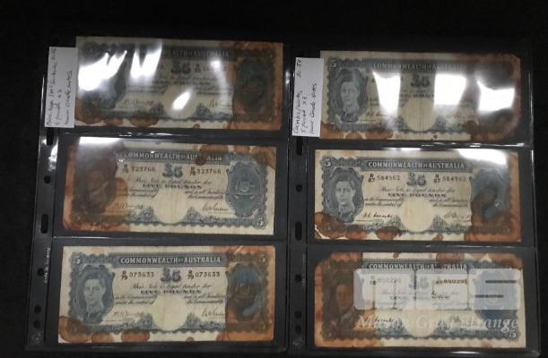 6 X AUSTRALIAN FIVE POUND BANKNOTES, 3 X COOMBES/WATTS, 3 X ARMITAGE/McFARLANE R PREFIXES, RUST STAINING DAMAGE