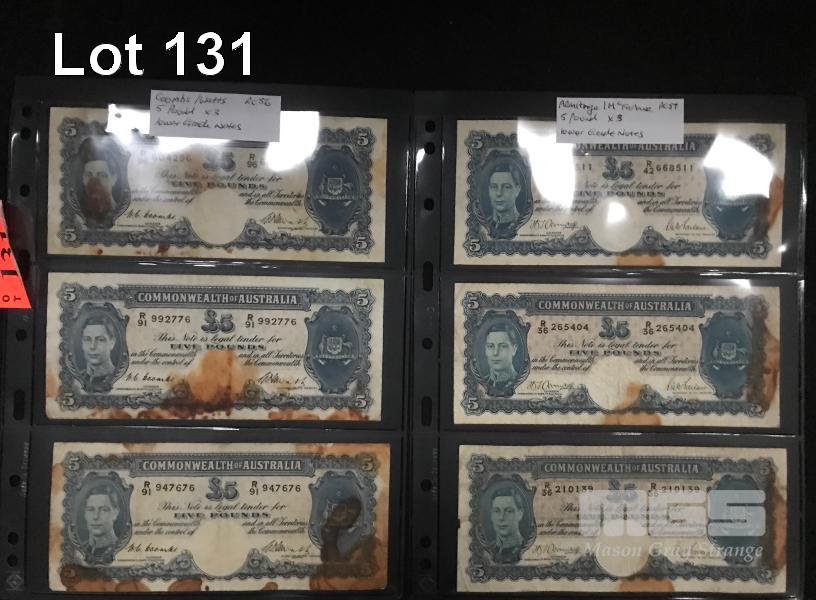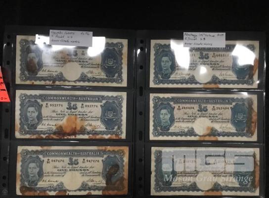 6 X AUSTRALIAN FIVE POUND BANKNOTES, 3 X COOMBES/WATTS, 3 X ARMITAGE/McFARLANE R PREFIXES, RUST STAINING DAMAGE