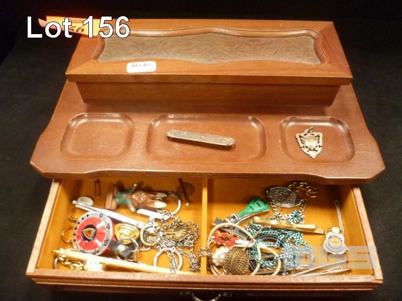 TIMBER JEWELLERY BOX, DRESS JEWELLERY, ETC WITH HALLMARKED SILVER PENDANT, ENGRAVED, 23/3/12