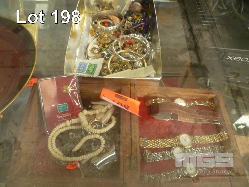 MIXED JEWELLERY WATCHES BANGLES ETC IN TIN AND A BOX