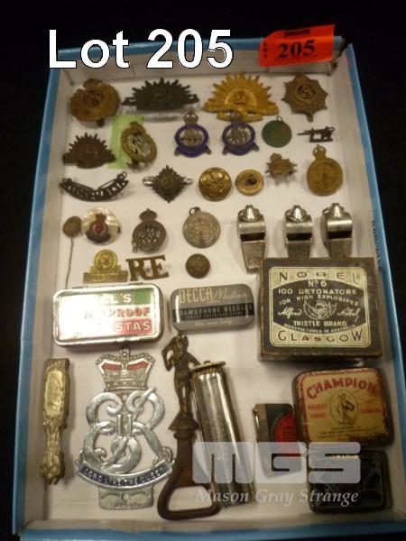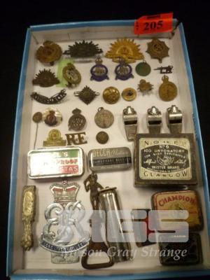 MILITARY BADGES, GRAMAPHONE NEEDLE TINS, SPORT WHISTLES, ETC