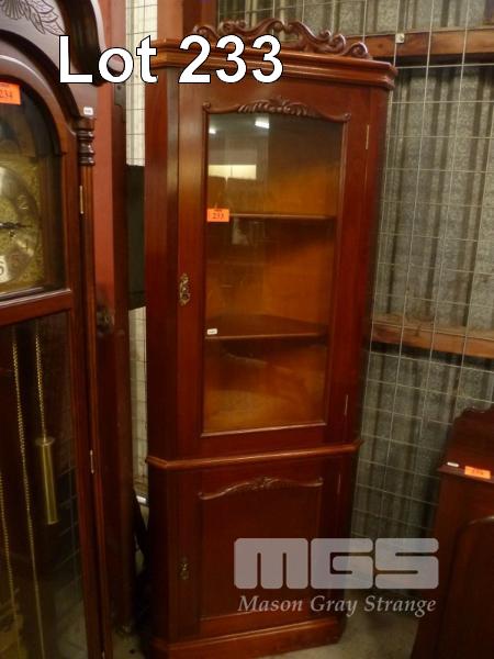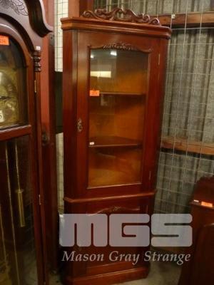 MAHOGANY CORNER DISPLAY CABINET, 3 TIER, SINGLE DOOR UNDERSTORAGE,