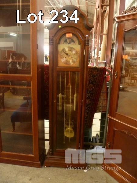TIMBER LONG CASED CLOCK, GLASS FRONTED & SIDES, PENDULUM & WEIGHTS