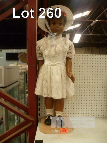 EARLY DRESS DOLL ON STAND, LACE DRESS, SHOES & HAT,MARKED AE3651 TO REAR OF HEAD