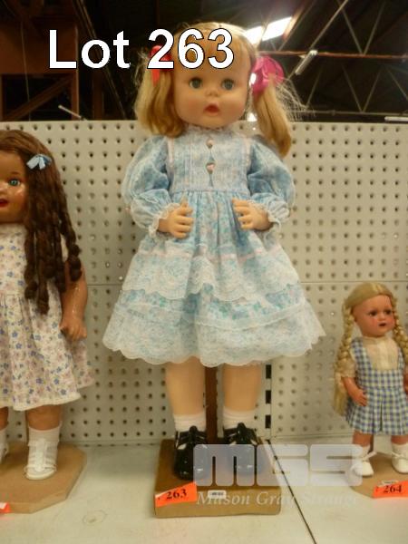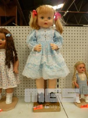 DOLL ON STAND, FLORAL & LACE DRESS, SHOES & PIGTAILS, MARKED MADE IN CHINA