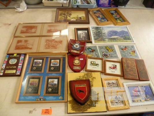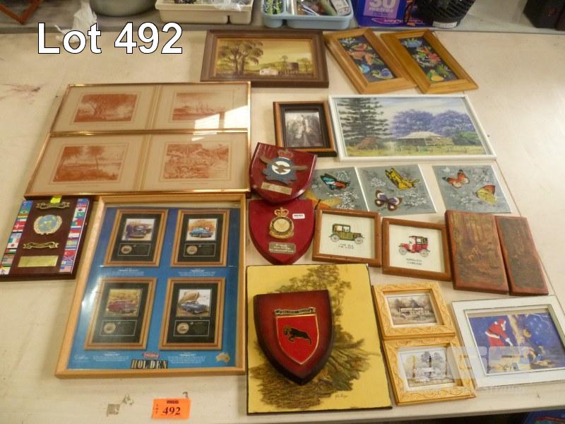ASSORTED FRAMED PRINTS, WALL ART, MILITARY PLAQUES, ETC