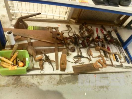 ASSORTED VINTAGE CARPENTERS TOOLS INC SAWS, DRILLS, ETC