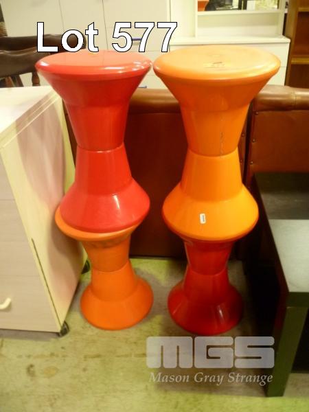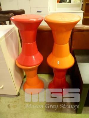 4 x CAROMA PLASTIC STOOLS, 2 x RED & 2 x ORANGE