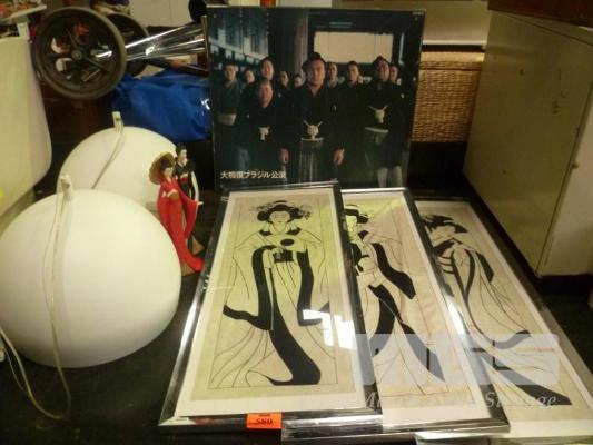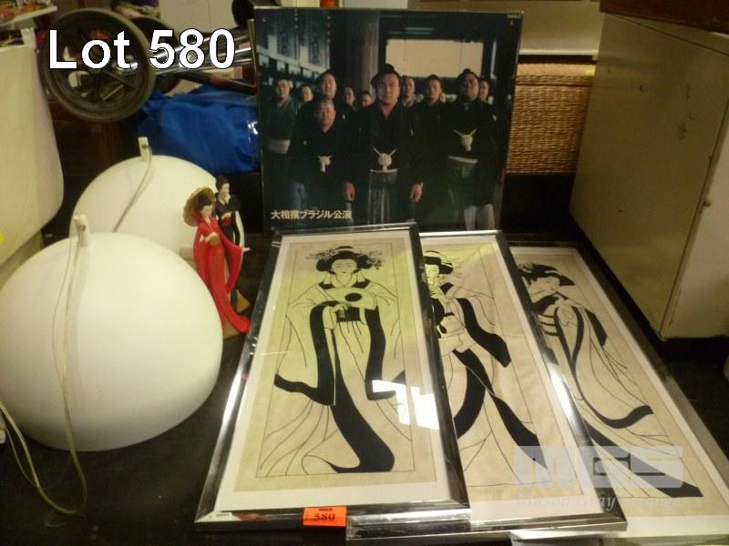 PAIR DOME CEILING LIGHTS WITH ORIENTAL STYLE FIGURINES, CLOTH FRAMED PRINTS & BLOCK MOUNT PRINT