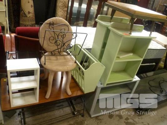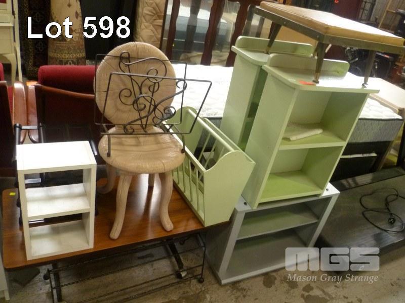 MOBILE COFFEE TABLE, CHILDRENS CHAIR, 2 x MAGAZINE RACKS, SMALL BOOKCASES, ENTERTAINEMNT UNIT, ETC