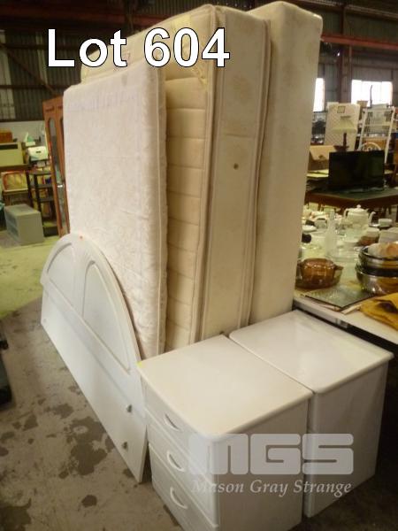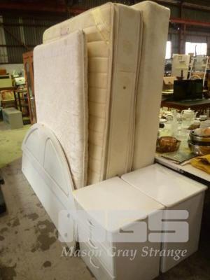 BEDROM SUITE, QUEEN SIZE ENSEMBLE BED BASE, ST MORITZ MATRRESS, MATTRESS TOPPER, WHITE FITTED, ARCH TOP BEDHEAD WITH PAIR 4 DRAWER BEDSIDE CABINETS