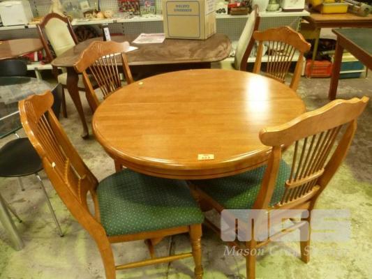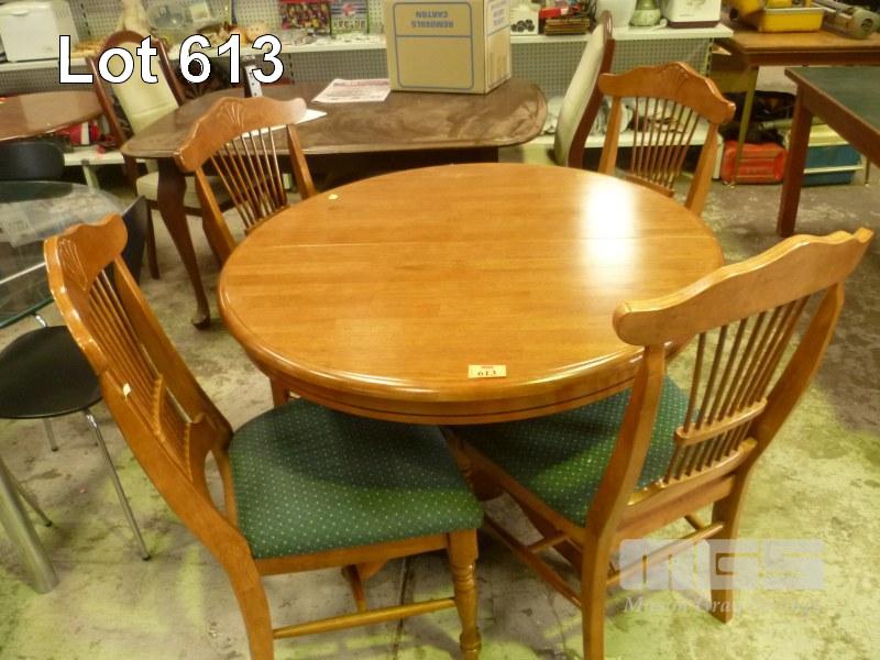 5 PIECE DINING SUITE, RUBBERWOOD CIRCULAR DINING TABLE & 4 x SLAT BACKED DINING CHAIRS