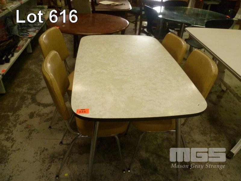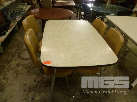 KITCHEN DINING SUITE INC RECTANGULAR TABLE, LAMINATE TOP, CHROME LEGS & 4 x BEIGE VINYL CHAIRS