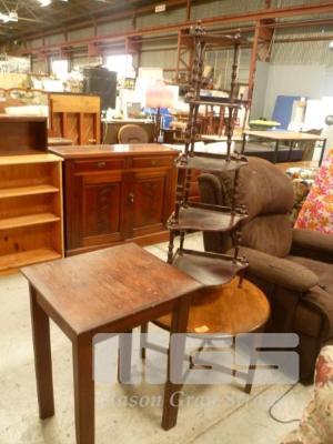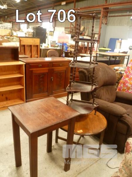 ROUND TIMBER OCCASSIONAL TABLE, SQUARE SIDE TABLE & CORNER WHATNOT