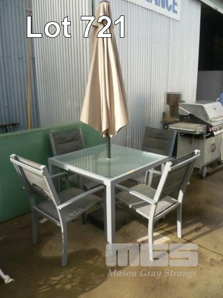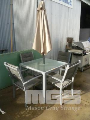 OUTDOOR SETTING, ALUMINUM FRAMED, GLASS TOP SQUARE TABLE, 4 x CHAIRS, UMBRELLA & BASE