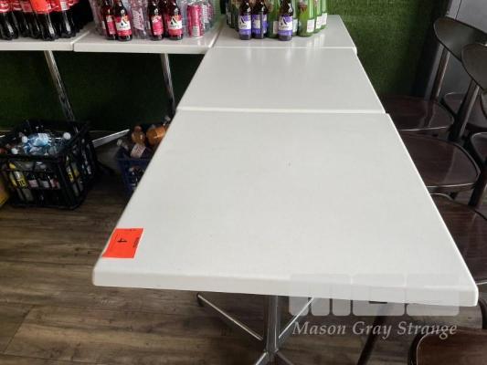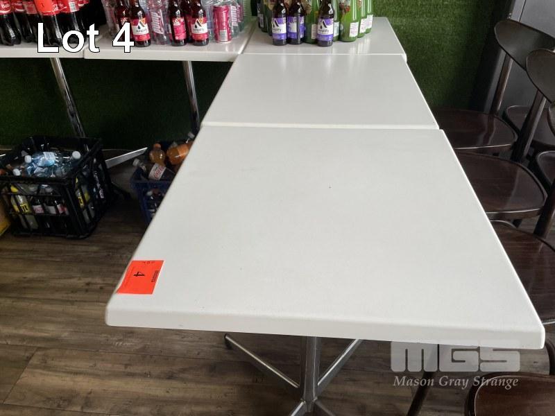 6 X CAFE TABLES, 60 x 60cm, WHITE ACRYLIC TOP, CHROME BASE