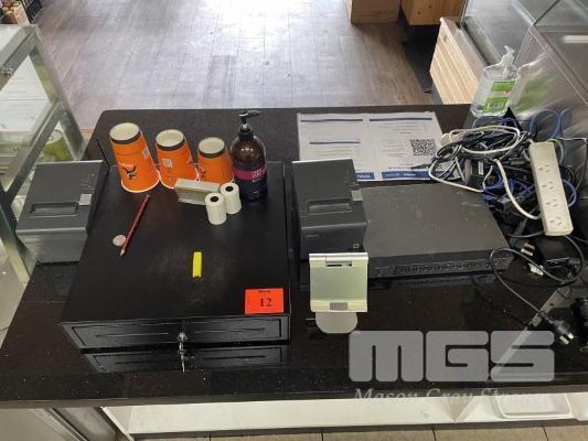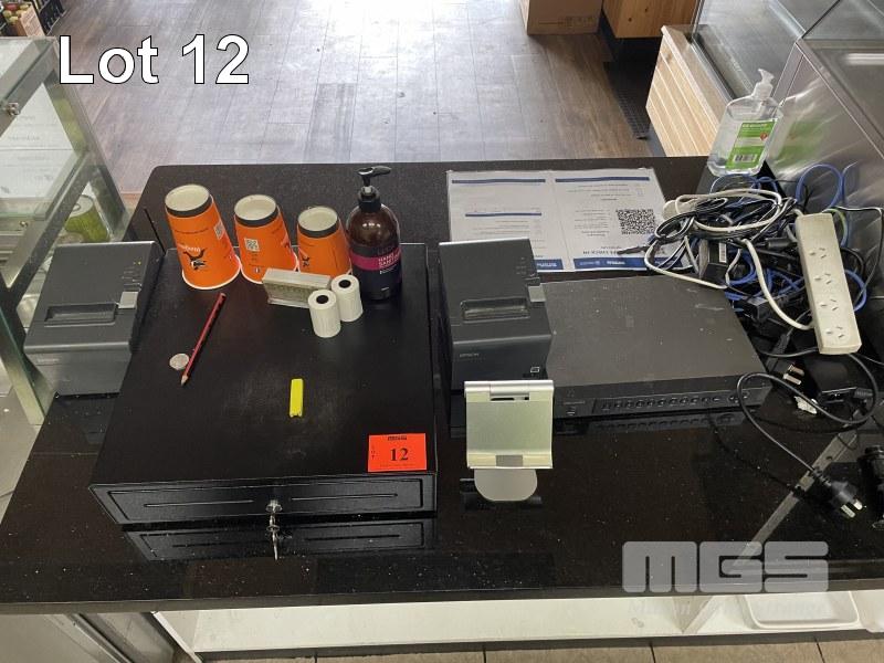 CASH DRAWER, 2 x EPSON DOCKET PRINTERS, HIK VISION DVR, CABLES & 2 DRAWER FILING CABINET