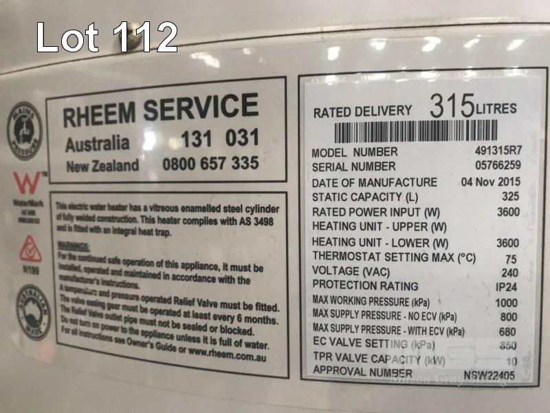 HWS, RHEEM, MOD: 491315R7 315 LITRE, 240V D.O.M. 2015