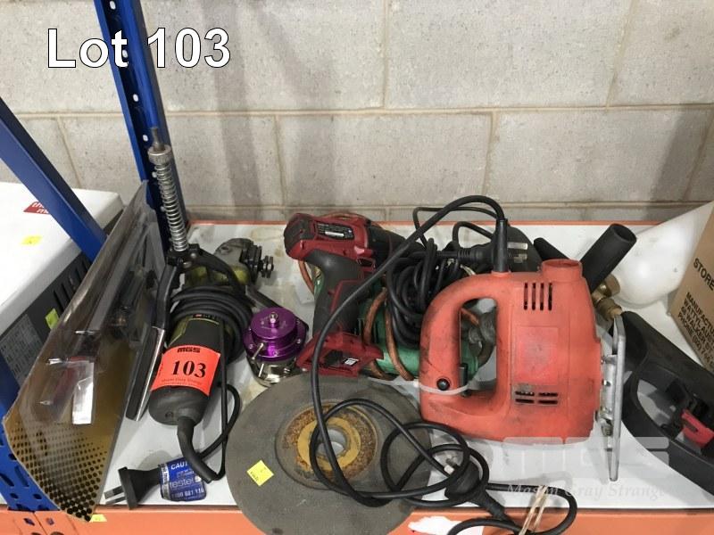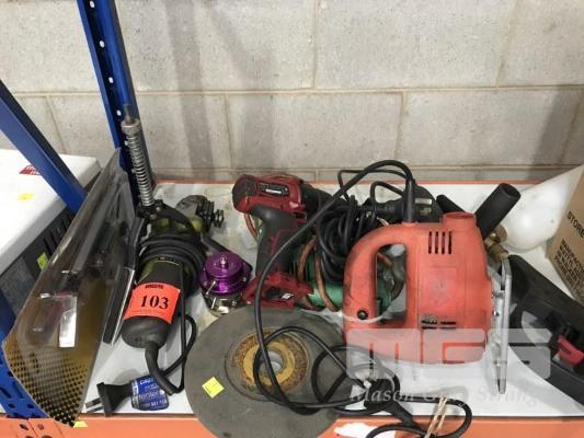 ASSORTED POWER TOOLS, INC 2 SPEED DRILL, 100mm ANGLE GRINDER WITH GRIND WHEEL, HONE, JIGSAW, PRESSURE SPRAY NOZZLE, ETC