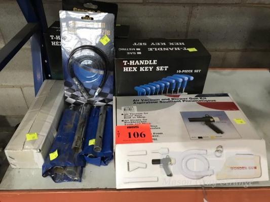 MIXED TOOL PACK, 2 x T-HANDLE SETS, SAE IMPERIAL 2 X TUBE SOCKET ROLLS VAC/BLOWER GUN KIT 2 x GREASE NOZZLES & 5 x TIN SHEARS