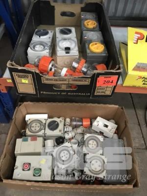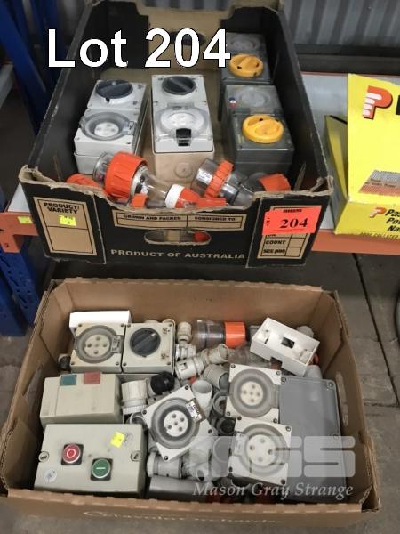 2 x BOXES ASSORTED 3 PHASE 415V ELECTRICAL OUTLETS, PLUGS, SWITCHES, ETC