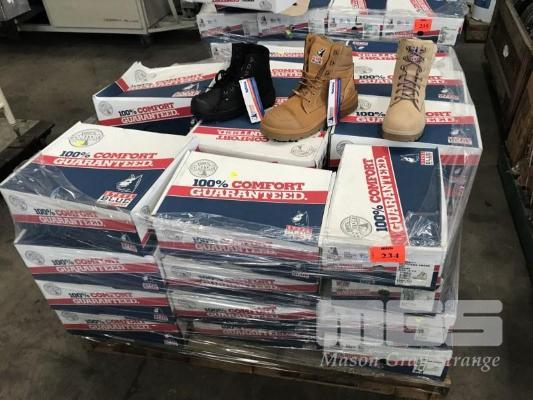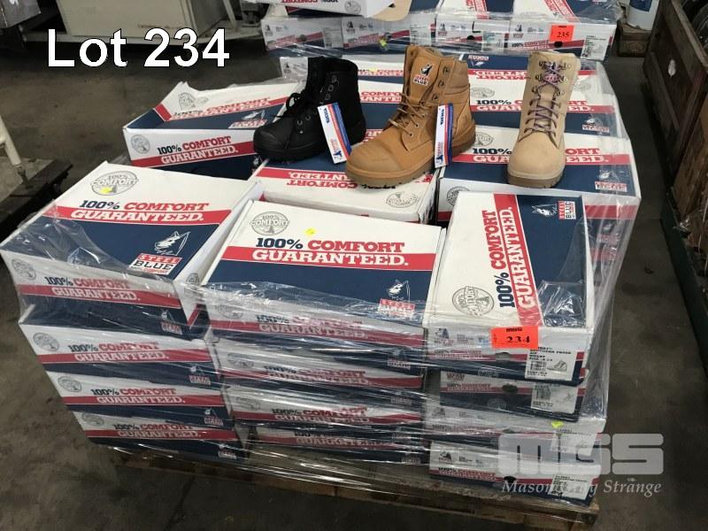 50 x PAIRS WORK BOOTS, STEEL BLUE, ASSORTED STYLES, SIZES & COLOURS