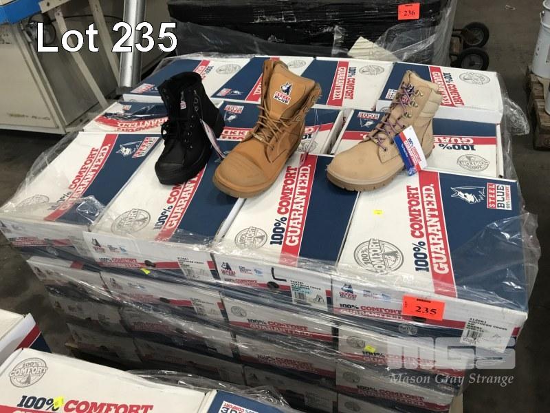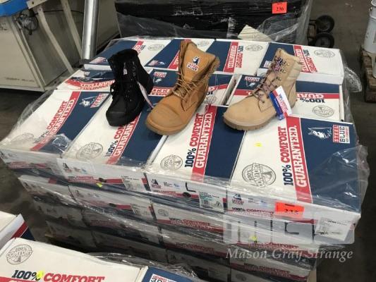 50 x PAIRS WORK BOOTS, STEEL BLUE, ASSORTED STYLES, SIZES & COLOURS