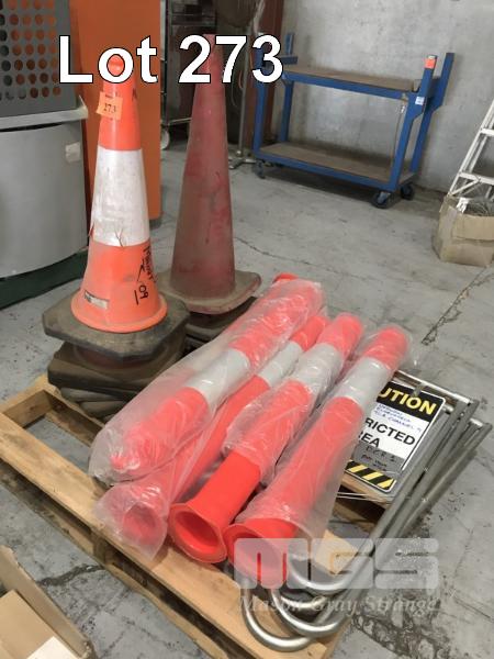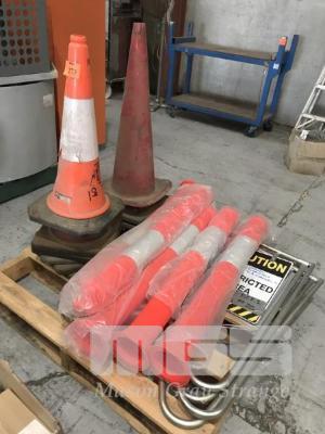 8 x SAFETY CONES, 5 x BOLLARDS, (NO BASES) & 2 x FOLD OUT SIGNS