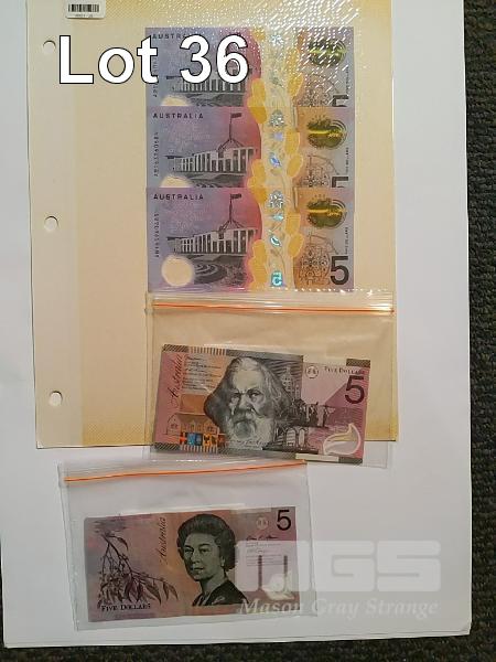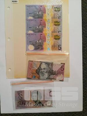 5 X AUSTRALIA, $5, POLYMER BANKNOTES, INC; DA 07407320, EH 01799080, AB 163960685, AB 163960684, AB 163960678