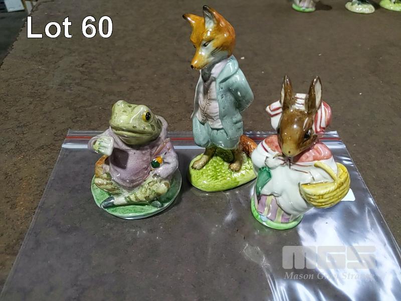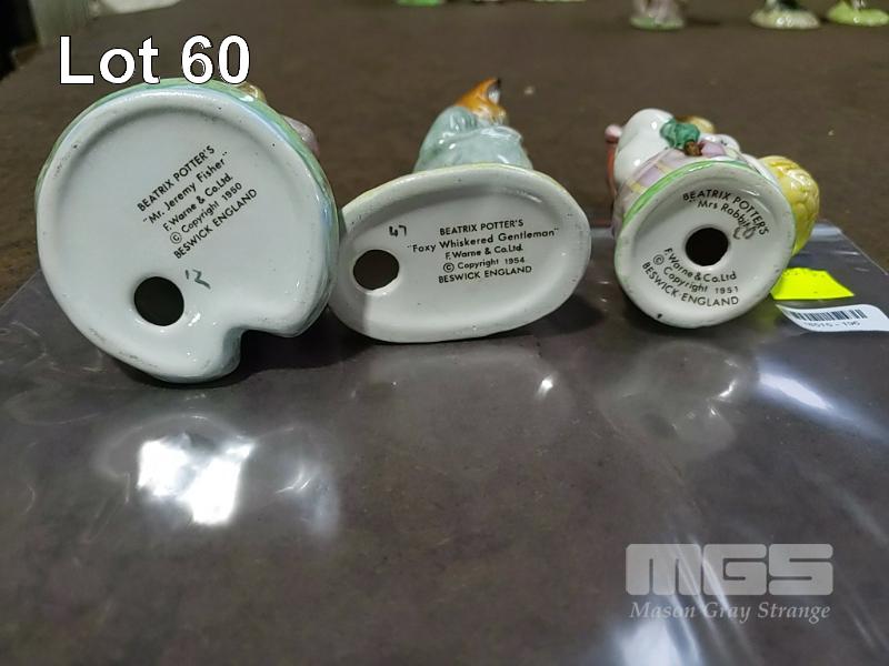 BEATRIX POTTER'S "MR JEREMY FISHER" FIGURINE "F. WARNE & CO.LTD. (C) COPYRIGHT 1950 BESWICK ENGLAND" BEATRIX POTTER'S "FOXY WHISKERED GENTLEMAN" FIGURINE "F. WARNE & CO.LTD. (C) COPYRIGHT 1954 BESWICK ENGLAND" BEATRIX POTTER'S "MRS RABBIT" FIGURINE "F. WARNE & CO.LTD. (C) COPYRIGHT 1951 BESWICK ENGLAND"